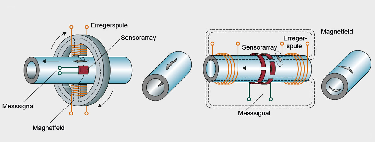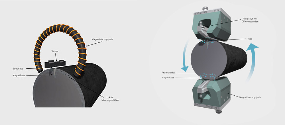 Zur Detektion von längsorientierten Fehlern wird der Magnetfluss zirkulär mit zwei rotierenden Jochen aufgebaut (s. Abbildung links). Die rotierenden Magnetfeldsensoren nehmen den an Fehlstellen austretenden Streufluss auf.